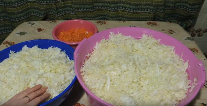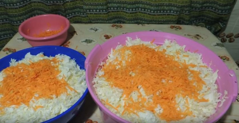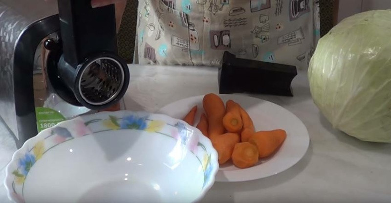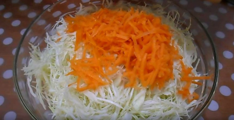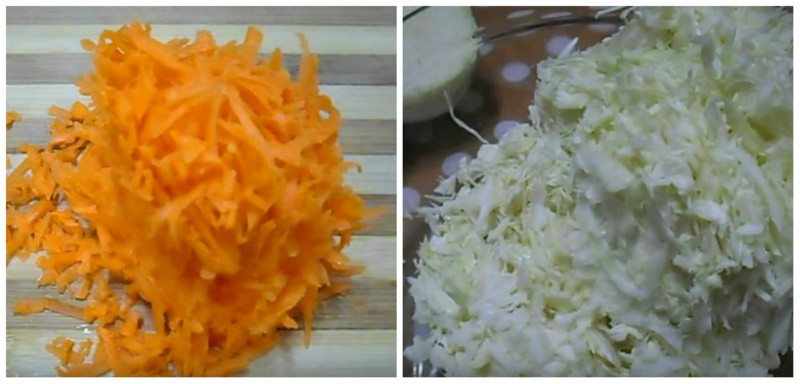 1. Сразу заготавливаем овощи. Капусту шинкуем на шинковке или рубим ножом, а морковь трём на обычной тёрке.