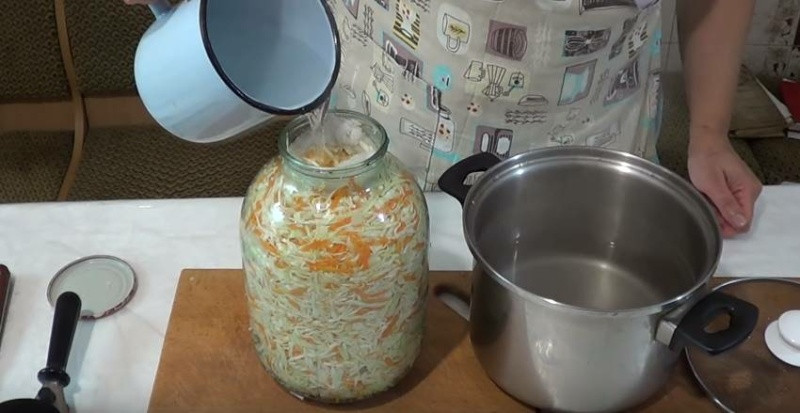 8. Только что снятым с печки рассолом поливаем капусту. Запомните, что жидкость должна быть обязательно горячей, ведь именно в этом таится секрет быстрого приготовления.