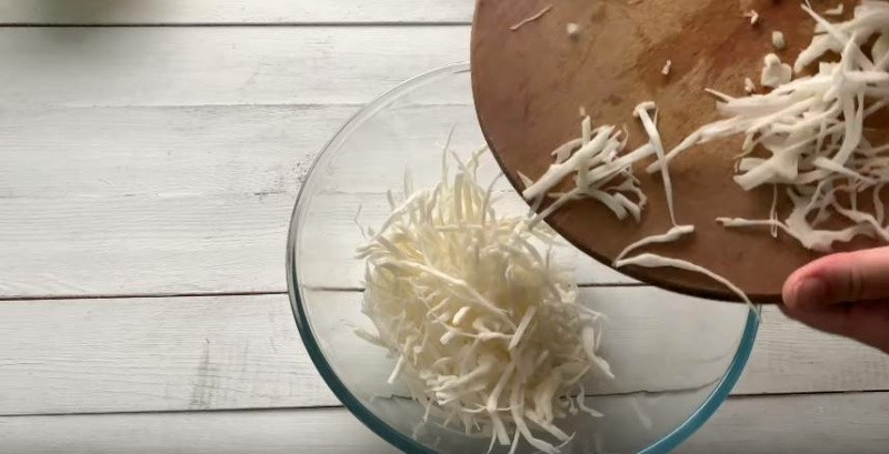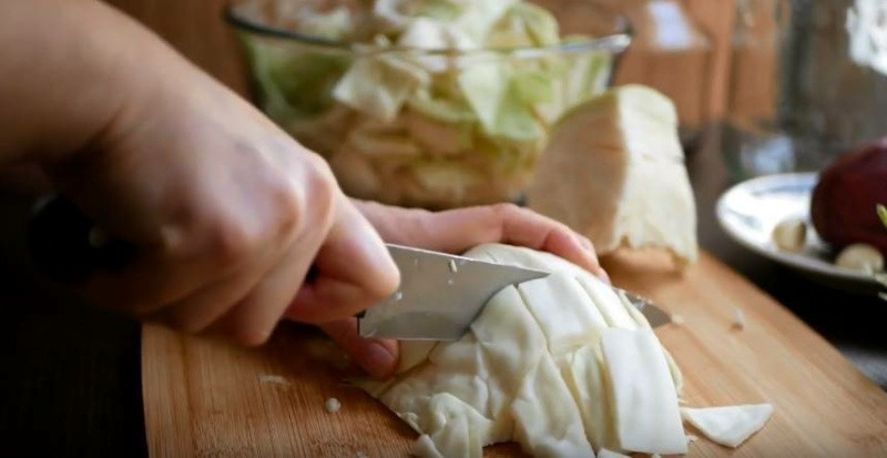 1. Первым делом мелко шинкуем капусту. Для этого проще всего воспользоваться специальной шинковкой, но в случае её отсутствия подойдёт обычный нож. После того как всё покрошили, сразу перекладываем овощ в миску, где будет всё мариноваться.