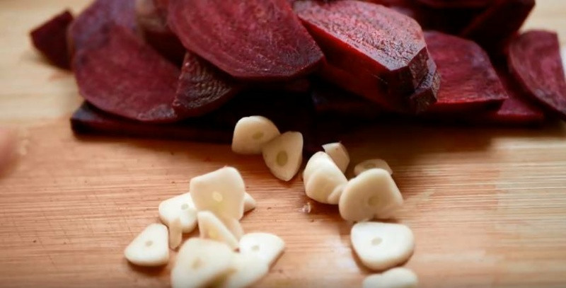 2. Свеклу очищаем от кожуры и нарезаем небольшими слайсами. Овощ берём сырой и без всяких изъянов. При наличии подозрительных пятен их лучше вырезать ножом. Перекладываем всё в отдельную миску.