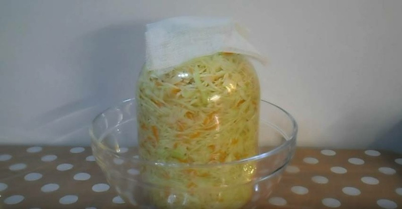 5. Накрываем бутыль марлей и оставляем его на столе при комнатной температуре на 3-4 суток. На протяжении этого времени необходимо 2 раза в день делать в салате проколы, потому что жидкость будет подниматься и её надо осаживать.