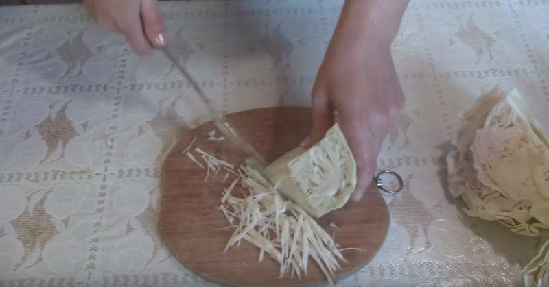 1. Капусту очищаем от грязных листьев, моем и начинаем шинковать. Достаточно размера мелкой соломки.