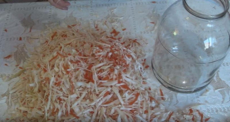 3. После подготовки необходимо смешать два ингредиента. Только во время перемешивания не стараемся сжимать капусту с морковью, чтобы пошел сок. Достаточно легкими движениями всё соединить между собой. На данном этапе также добавляем лавровый лист, ломая его на кусочки.