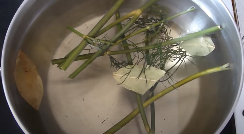 1. Первым делом необходимо приготовить рассол, в котором помидоры будут набираться вкуса. Для этого в кастрюлю вливаем 1 л воды и всыпаем 2 ст. л. соли. Туда же для аромата отправляем зонтики и стебли укропа, несколько лавровых листочков. Далее по вкусу забрасываем черный перец и душистый горошек. Даем всем ингредиентам прокипеть пару минут.