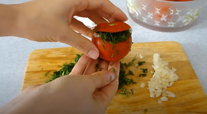 5. Когда у нас все ингредиенты подготовлены снова займемся помидорами. Под крышечку отправляем небольшую щепотку соли, следом кладем чеснок и укроп. Теперь все прижимаем и отправляем в емкость, в которой будет осуществляться посол. Так делаем со всеми красными овощами.