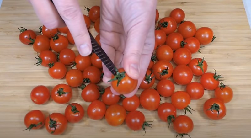 2. Теперь займемся помидорами. Их хорошо моем, убираем хвостики и плодоножки, если такие присутствуют. Затем при помощи острого ножа делаем не полный надрез, формируя крышечку.