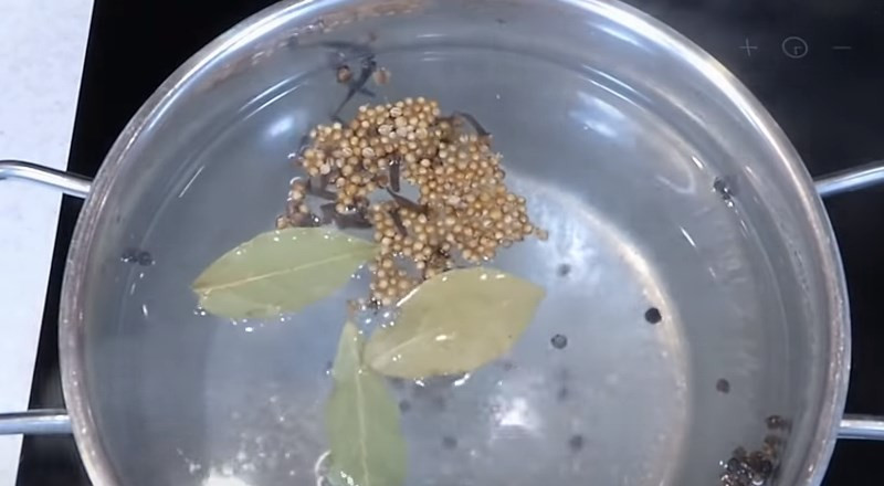4. Теперь приготовим рассол. Для этого наливаем в кастрюлю 1 л воды и доводим ее до кипения. Затем засыпаем туда соль, перец, гвоздику, кориандр и лавровый лист. Даем смеси прокипеть примерно минуту и снимаем с огня.