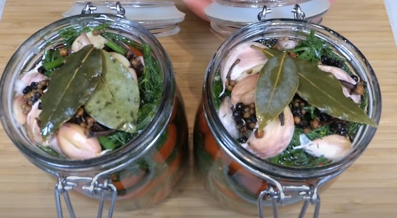 5. Далее подготовьте 2 банки объемом 1 л: помойте их и обсушите. Теперь можно укладывать в них ингредиенты по слоям: 1 слой — часть укропа, 2 слой — часть чеснока, 3 слой — часть помидор. Потом снова укроп и т. д. пока банка не будет полностью наполнена.