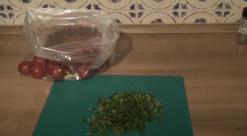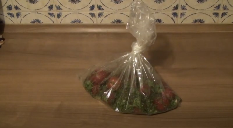 3. Теперь пакет закрываем или завязываем и начинаем хорошенечко перемешивать между собой. Специи и зелень должны «окутать» помидоры, чтобы напитать их своим ароматом и вкусом.