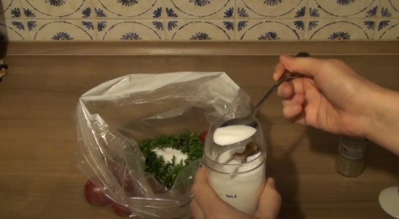 5. Отправляем чеснок и зелень в пакет с помидорами. Добавляем соль, сахар и черный молотый перец. Любители острого могут насыпать острый перец.