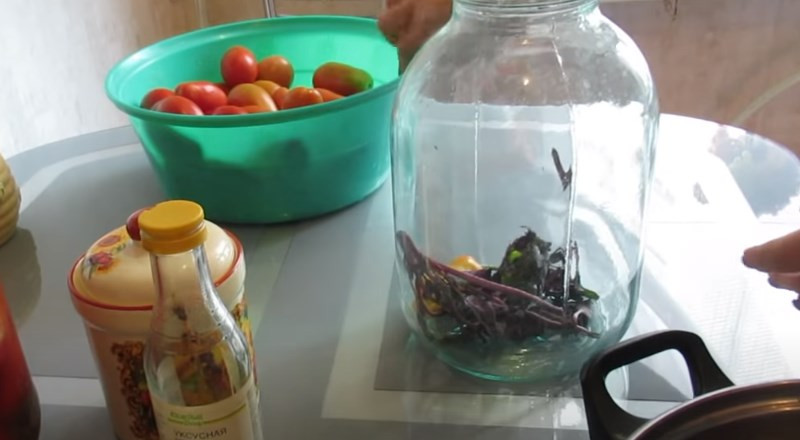 3. Тем временем помидоры хорошо промываем, убираем плодоножки и испорченные овощи. Далее начинаем плотно укладывать томаты в банку.