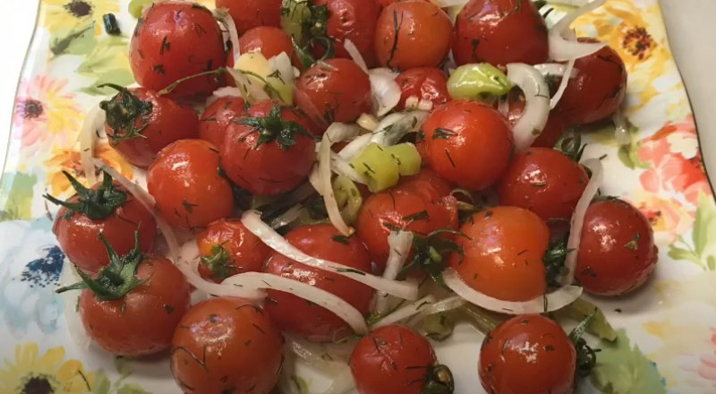 Давайте ознакомимся с первым рецептом из подборки. Подготовка всех ингредиентов для посола помидор займет не больше 10 минут, а постоять они должны будут хотя бы 12 часов. Это нужно для того, чтобы красные овощи взяли в себя пряные ароматы зелени, чеснока и в нужной мере просолились.