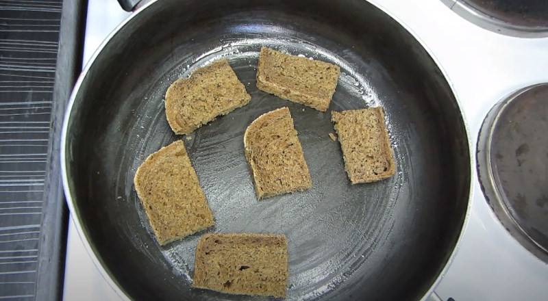 1. Вначале необходимо обжарить ломтики черного хлеба на растительном масле. Для этого выкладываем кусочки на сковороду и обжариваем с обеих сторон. Но делать это надо аккуратно, чтобы ломтики были на небольшом расстоянии друг от друга, а касаться могли только корочками. Если выложить их более хаотично, кусочки могут не прожариться равномерно.