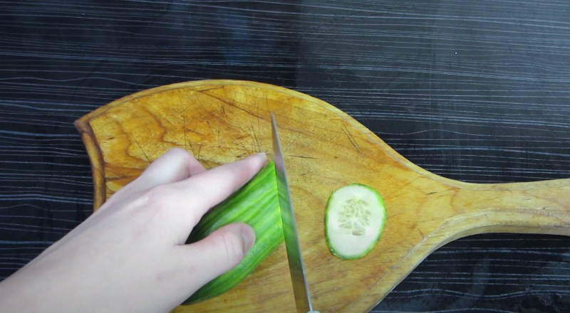 6. Свежий огурец промыть под проточной водой и нарезать на тонкие слайсы.