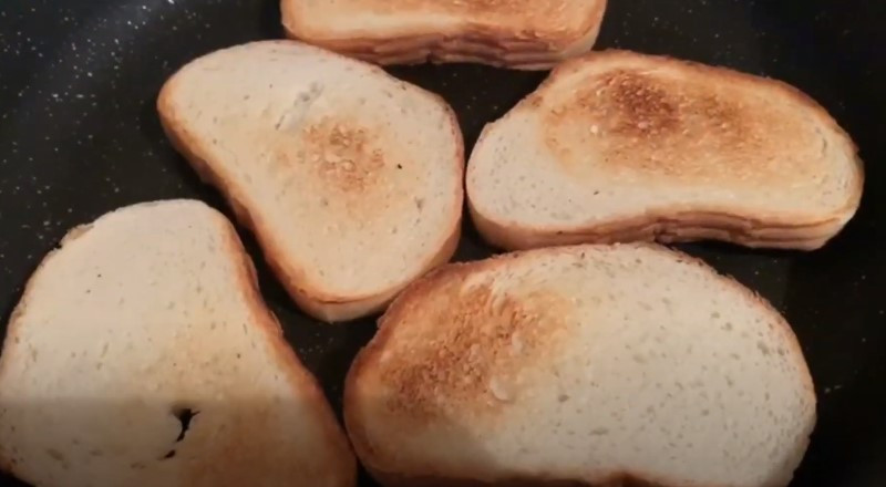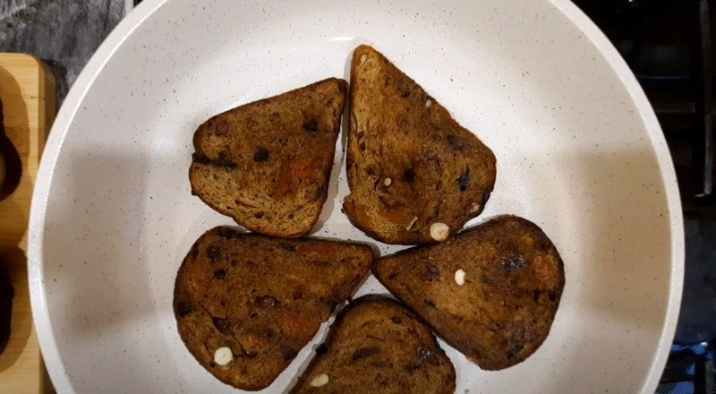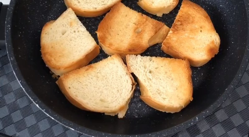 Снять хлебные гренки со сковороды и убрать их остывать.