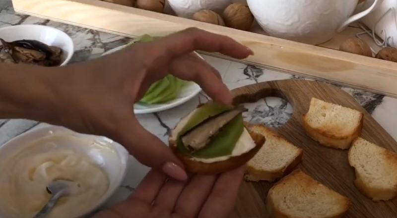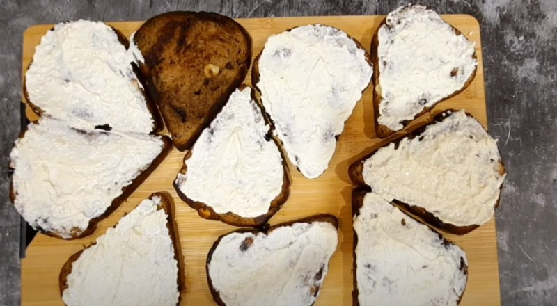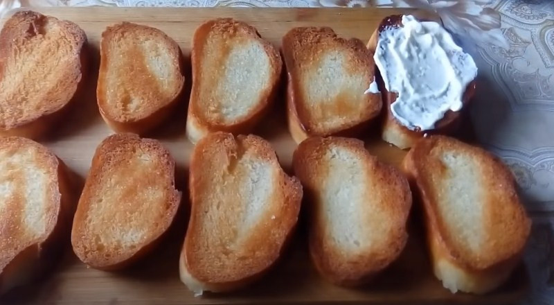 Главное, не передержать ломтики и не пересушить, иначе сухой хлеб изрядно подпортит вкус готовой закуски.