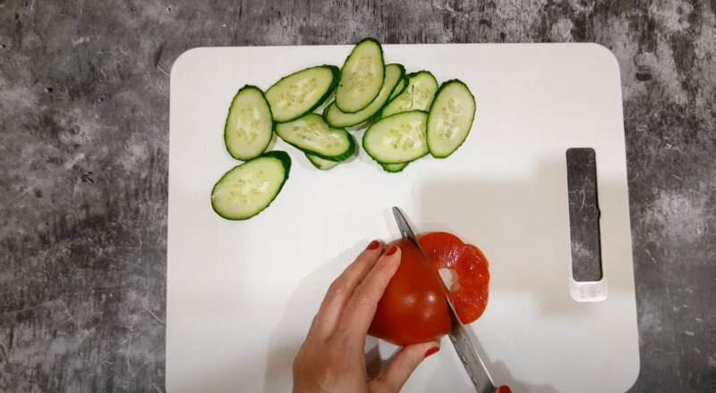 4. Помидор и огурец нарезать на тонкие ломтики. Чем тоньше кусочек, тем презентабельнее он будет выглядеть на бутерброде.