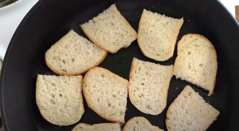 1. Батон нарезать на ломтики одинаковой величины. Обжарить хлеб на сковороде с минимальным количеством растительного масла.