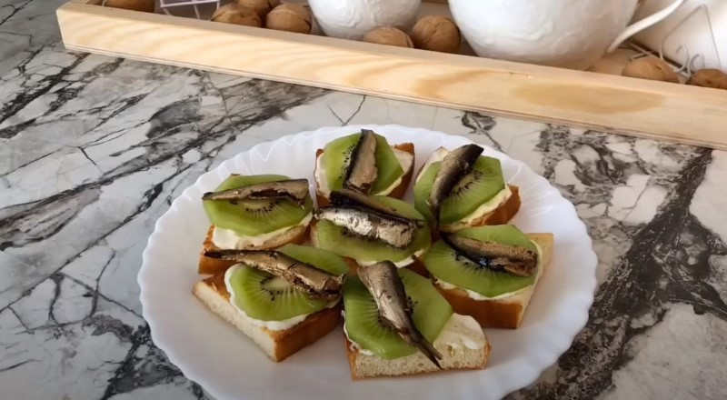 Некоторым кажется непривычным сочетание шпротов с киви. Но поверьте, такие закуски улетают со стола в первую очередь, именно из-за необычности ингредиентов.