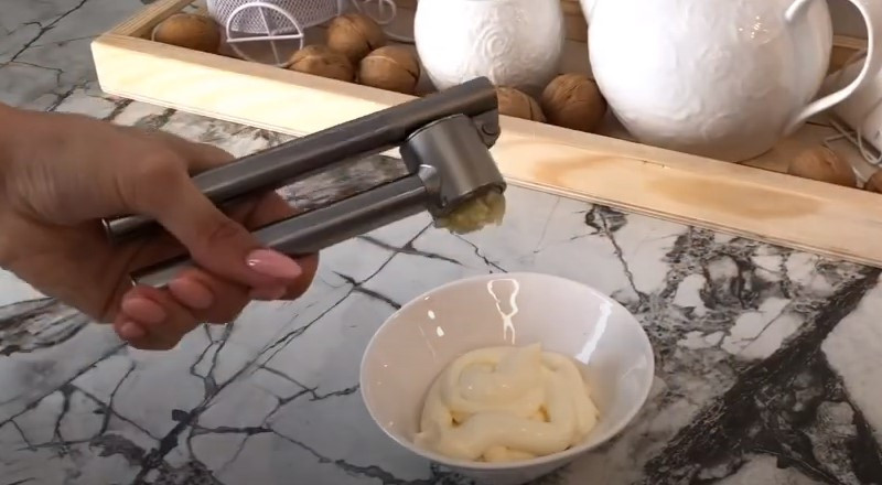 2. В отдельную мисочку выложить майонез, сюда же отправить измельченный чеснок. При желании его можно пропустить через чеснокодавку или измельчить на мелкой терке.