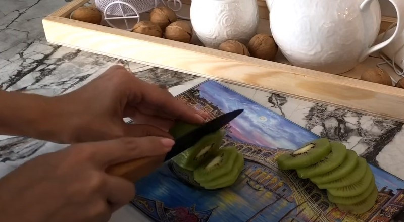 3. Киви почистить и нарезать на тонкие ломтики. Лучше всего брать фрукт средней спелости. Он не должен быть совсем зелёным, то есть деревянным, но и не слишком мягким, чтобы он не превратился в кашу при нарезании.