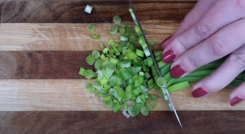 6. В это время можно заняться украшением закуски. Для этого предварительно промытые веточки зеленого лука нарезать на небольшие кусочки.