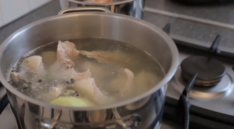 2. В кастрюлю, наполненную водой, выкладываем голову и хвост судака, отправляем туда же несколько лавровых листочков. Приправляем все горошинами черного перца, а также присаливаем по вкусу.