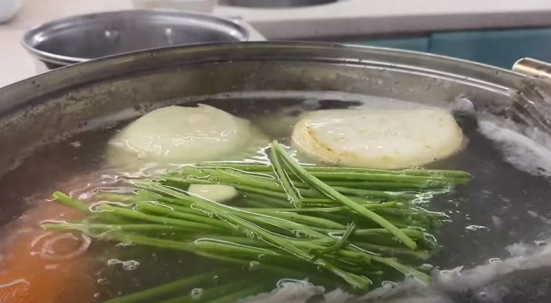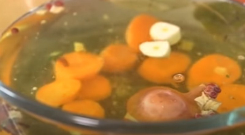 2. Убавляем огонь до минимума и отправляем в кастрюлю овощи. Нам понадобятся очищенная цельная морковь, луковица, корень сельдерея, дольки чеснока, стебли петрушки. Варим все это на протяжении трех часов.