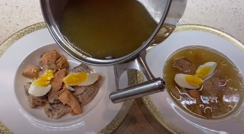 5. Добавляем жидкость с желатином в пиале к оставшемуся бульону. Все хорошо перемешиваем.