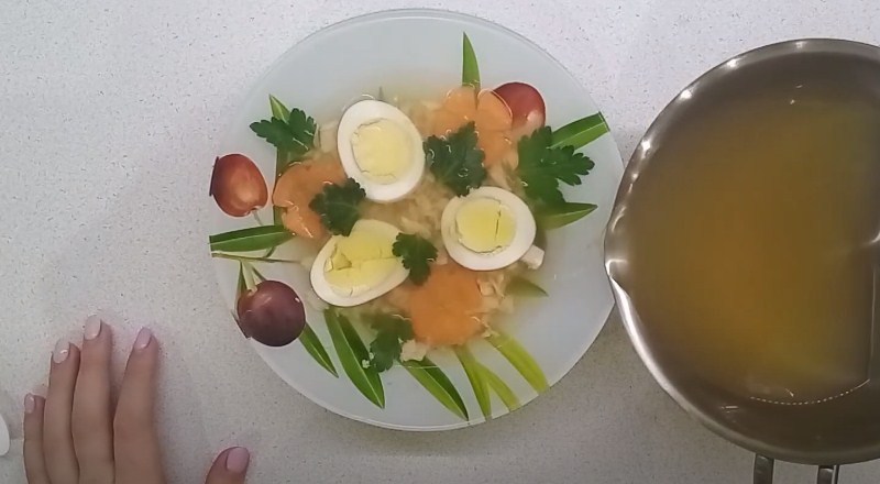 10. Теперь аккуратно заливаем все подготовленные продукты бульоном с желатином. Отправляем всё в холодильник на 4-5 часов.