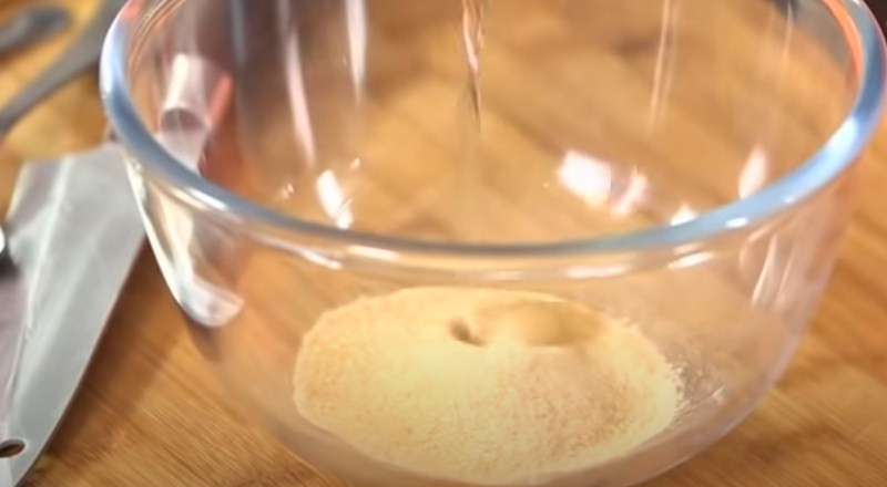 3. В глубокую миску всыпаем подготовленный желатин. Заливаем все небольшим количеством воды комнатной температуры. Теперь все нужно размешать до полного растворения желирующего вещества.